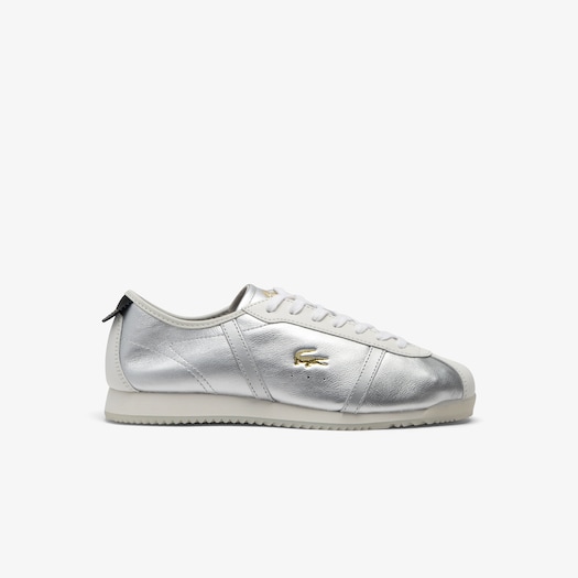 Sepatu wanita Lacoste dengan aksen warna emas yang memberikan kesan glamor, hadir dalam pilihan sneakers wanita putih yang elegan.