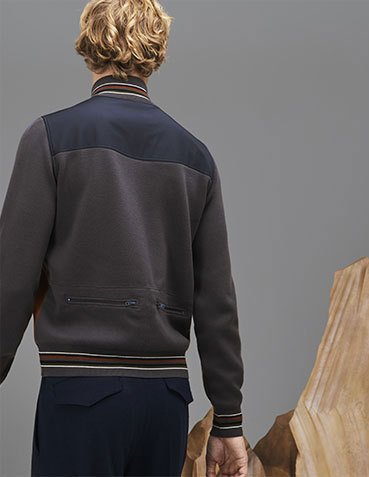 Una giacca in maglia di lana con inserti color block in tela tecnica è abbinata a larghi pantaloni in lana interlock. Lo sportswear diventa sartoriale.